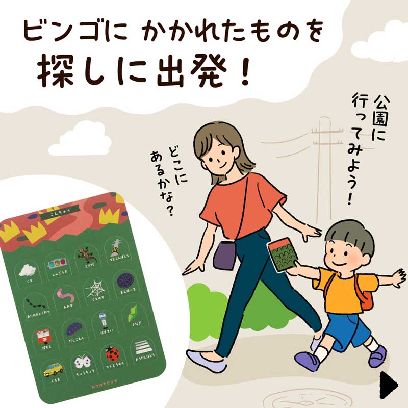 気分は宝探しの探検隊!ビンゴカードを持って宝探しに出発!ビンゴに描かれたアイテムを見つけたら、ビンゴの穴を開けていきます。
