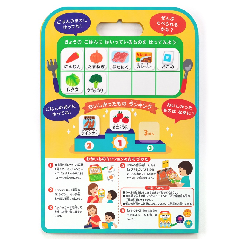 お子様にとって退屈になりがちなお買い物の時間を、楽しく学べる場へと変える商品です。親子で一緒にリストを作ったり、品物を探すことで、会話も広がり、食材へ興味を持つきっかけにもなります。