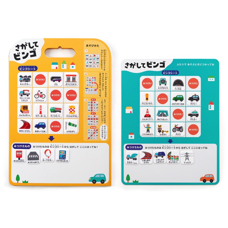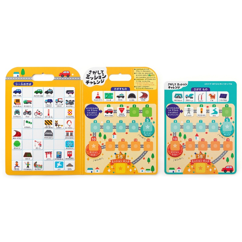 「ガソリンスタンド」「バス」「パトカー」など、48枚の「さがすものシール」が入っています。窓から見えるいろいろなものを探していく2種類のゲームで遊べます。